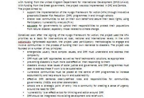 This executive summary outlines the findings of a learning review on ActionAid's 5 year Disaster Risk Reduction through Schools (DRRS) project, implemented in 9 countries across Africa, Asia and the Americas. The summary gives an overview of the project's approaches and methodologies, and outlines key factors for successful and sustainable DRR initiatives.