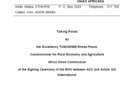 This documents summarises the Talking Points by Her Excellency TUMUSIIME Rhoda Peace, Commissioner for Rural Economy and Agriculture Africa Union Commission at the Signing Ceremony of the MOU between AUC and ActionAid International.
