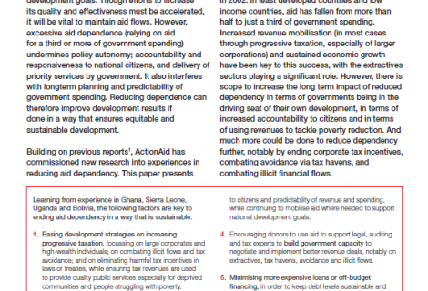 Aid continues to play an important role helping developing countries reduce poverty and inequality, and attaining global and national development goals. Though efforts to increase its quality and effectiveness must be accelerated, it will be vital to maintain aid flows. However, excessive aid dependence (relying on aid for a third or more of government spending) undermines policy autonomy; accountability and responsiveness to national citizens, and delivery of priority services by government. It also interferes with longterm planning and predictability of government spending. Reducing dependence can therefore improve development results if done in a way that ensures equitable and sustainable development.