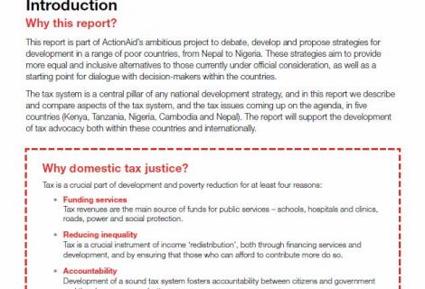 The tax system is a central pillar of any national development strategy, and in this report we describe and compare aspects of the tax system, and the tax issues coming up on the agenda, in five countries (Kenya, Tanzania, Nigeria, Cambodia and Nepal). The report will support the development of tax advocacy both within these countries and internationally.