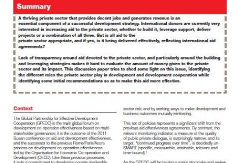 A thriving private sector that provides decent jobs and generates revenue is an essential component of a successful development strategy. International donors are currently very interested in increasing aid to the private sector, whether to build it, leverage support, deliver projects or a combination of all three. But is all aid to the private sector appropriate, and if yes, is it being delivered effectively, reflecting international aid agreements?