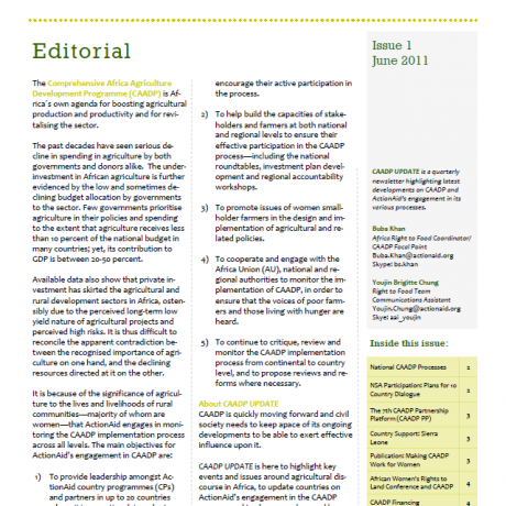 CAADP UPDATE, a quarterly newsletter produced by the International Right to Food Team, highlights key events and issues around agricultural discourse in Africa, to update countries on ActionAid’s
