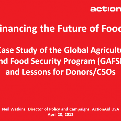 This is a presentataion Neil Wakins, Director of Policy & Campaigns, AA USA, gave on the Global Agriculture and Food Security Program (GAFSP) at the Civil Society Policy Forum of the IMF/WB Spring